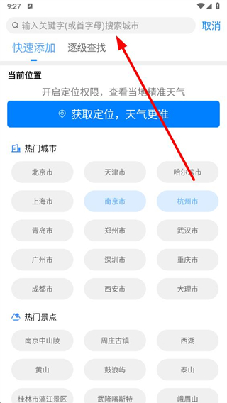 3、在城市搜索页面,通过搜索框输入关键词或选择热门城市,即可添加所需城市。