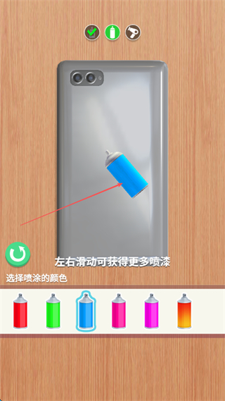 2、选择喷漆颜色如蓝色,左右滑动获取更多喷漆,喷涂手机壳。