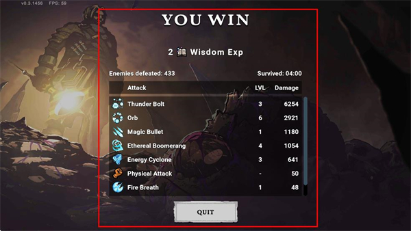 4、战斗胜利后查看结算界面,了解击败敌人数量、技能伤害等数据,点击退出继续游戏。