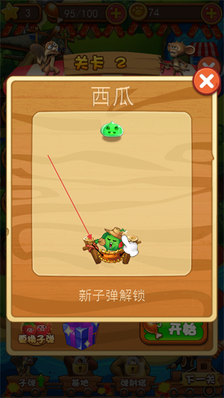 1、在关卡2解锁西瓜新子弹,点击选择子弹准备弹射。