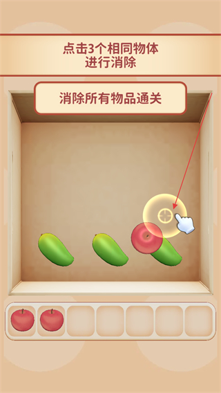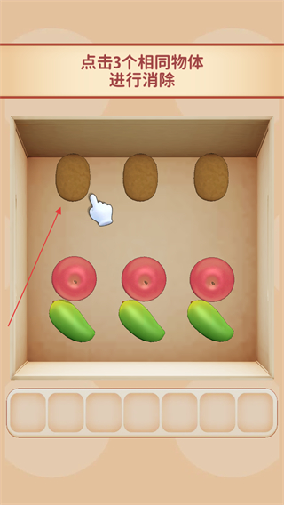 1、点击关卡内堆叠的甜品、玩具、水果等物品,使其进入下方收集栏。