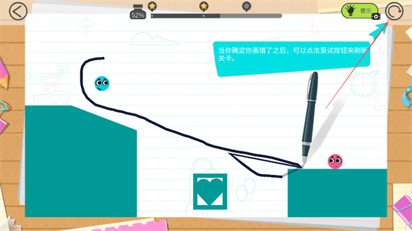 3、绘制好线条后,点击重试按钮,让蓝色小球沿线条移动,向粉色小球靠近。