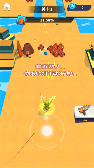 2、持续靠近敌人,自动射击消灭它们,同时收集蓝色宝石,提升关卡完成度。