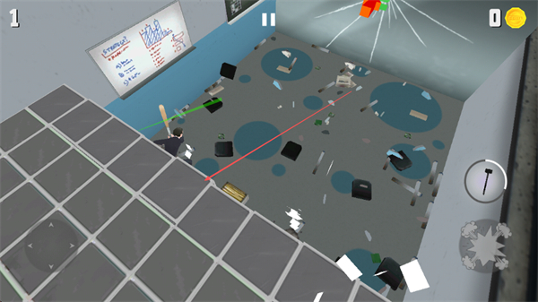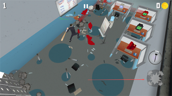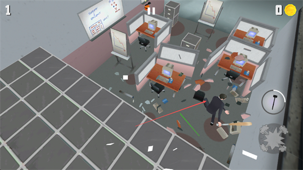1、操控角色在办公室内移动,用工具破坏办公桌椅、电脑等物品,制造混乱。