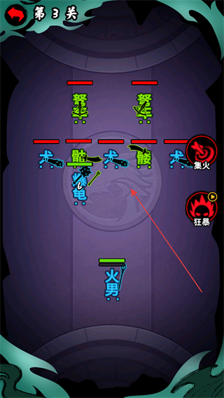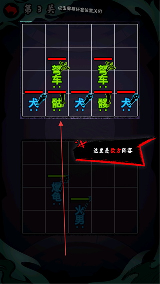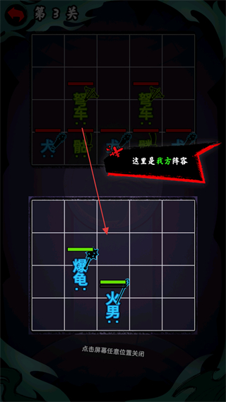 1、在关卡中如第3关,先查看敌方阵容如弩车、犬、髅和己方阵容如爆龟,了解双方布局。
