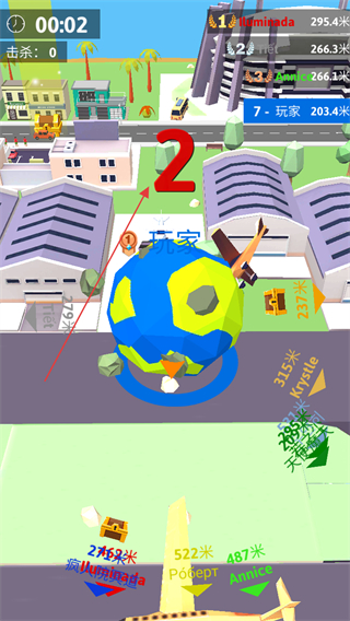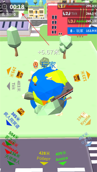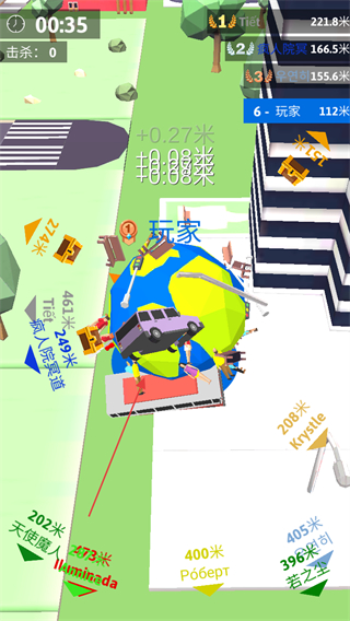 1、操控滚动球体在城市场景移动,吞噬车辆、建筑等物品增长体积,提升排名。