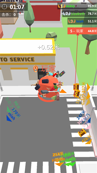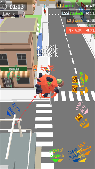 1、操控滚动的球体在城市街道移动,吞噬物品增长体积,提升排名。