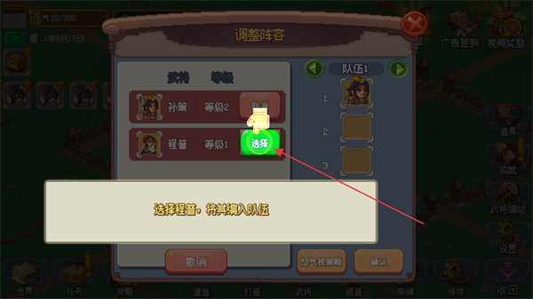 4、在调整阵容界面选择武将如程普,将其编入队伍,优化战斗阵容,为攻城等战斗做好准备。