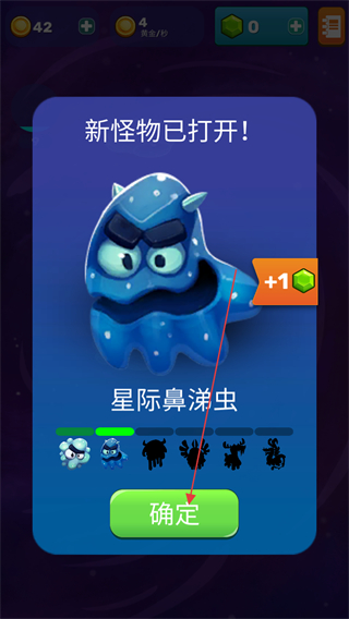 2、解锁星际鼻涕虫后点击确定,获得新怪物和绿宝石奖励。