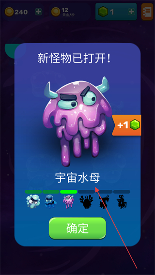 4、解锁宇宙水母后点击确定,获得新怪物和绿宝石,继续拓展怪物阵容。