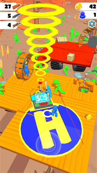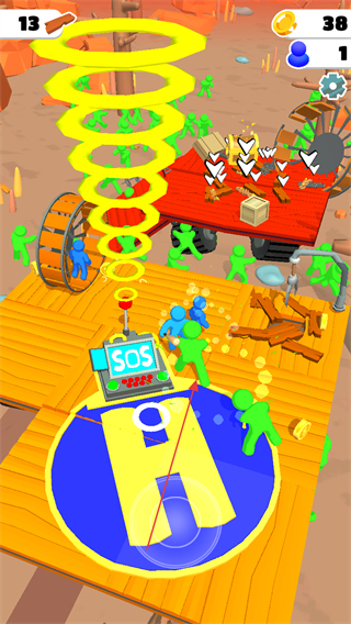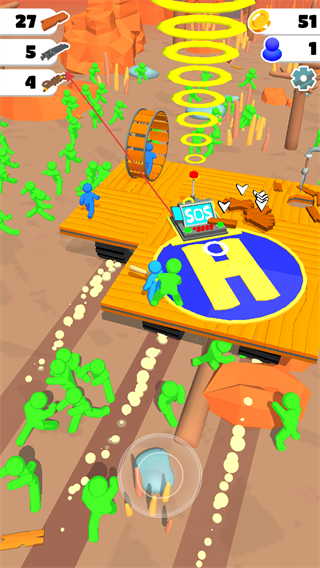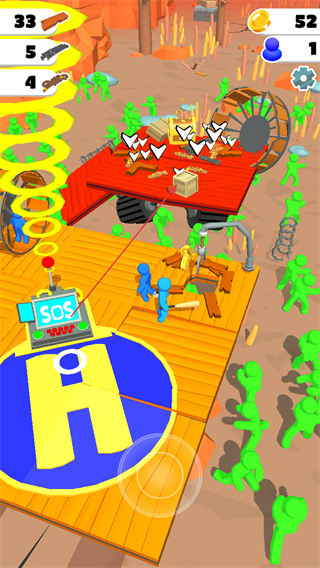 1、操作蓝色小人使用SOS设备发出求救信号,同时抵御绿色丧尸的进攻,积累资源。