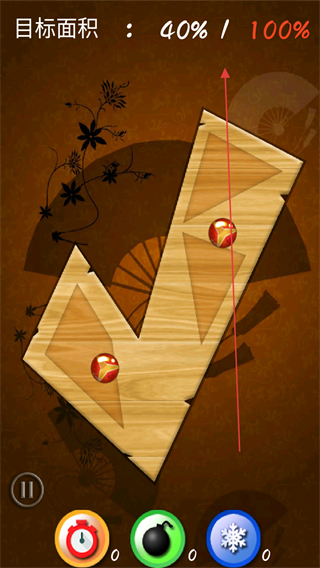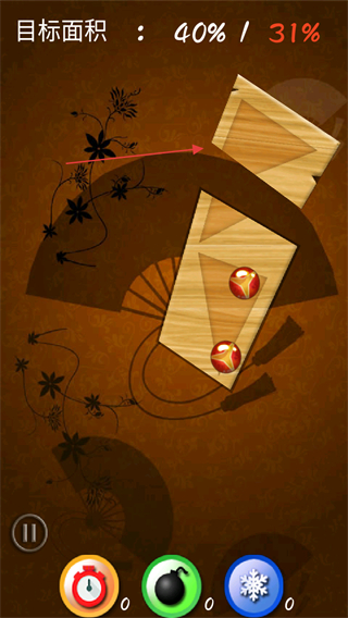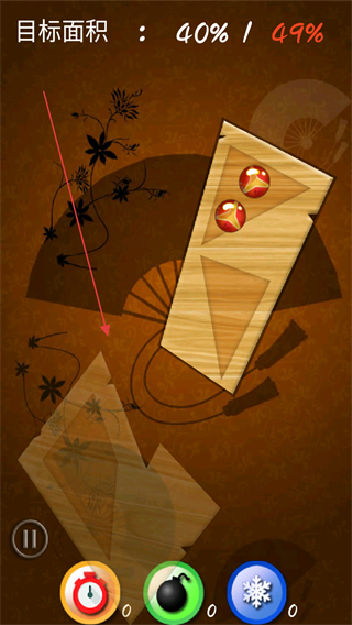 1、观察目标面积进度,操控刀具切割木板,注意躲避红色圆球。