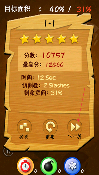 4、完成关卡后,查看分数、时间等数据,点击下一关继续挑战。