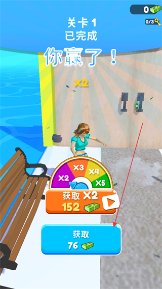 4、完成关卡后,可选择获取奖励,点击获取按钮领取绿色钞票,继续挑战下一关。