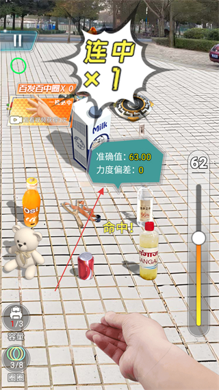 2、根据提示调节力度值,避免力度偏小,调整至合适力度投圈以命中物品。