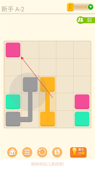 1、观察网格中相同颜色的方块,点击其中一个方块,然后找到与其颜色相同的另一个方块,绘制连线将它们连接起来。