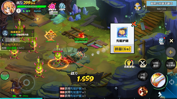 2、战斗中击败怪物,可获得装备如先驱护腿、先驱护肩和道具奖励,提升战力。