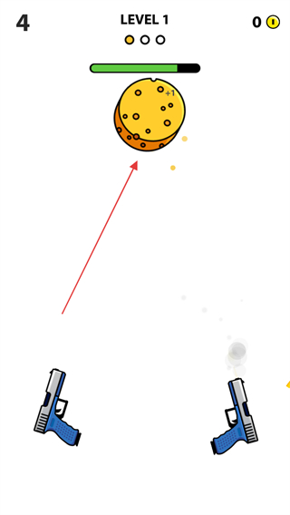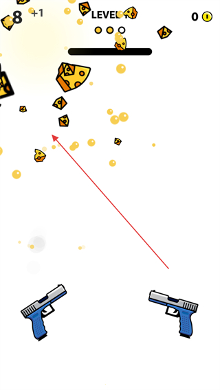 1、进入游戏,查看屏幕上方显示的关卡信息LEVEL1和剩余子弹数,点击屏幕开枪射击上方目标物,如奶酪。