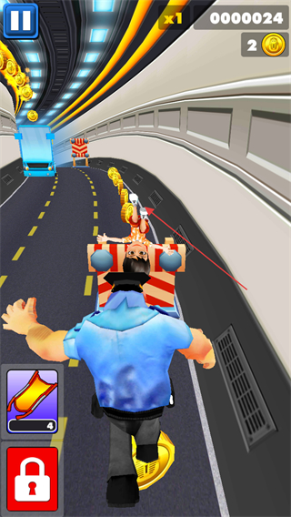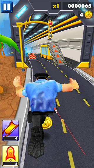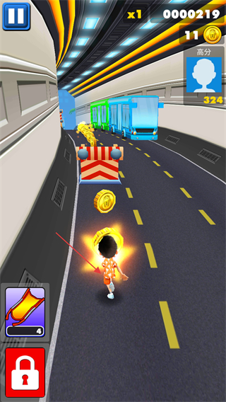 2、操控角色在隧道中继续奔跑,滑动屏幕躲避前方蓝色大巴与障碍物,尽可能多收集金币。