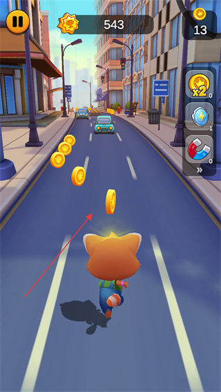 1、游戏开始,操控宠物猫在街道上奔跑,左右滑动屏幕躲避车辆,同时收集路上的金币。