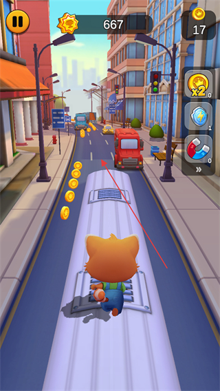 2、持续奔跑,当遇到较长的车辆时,滑动屏幕让宠物猫跳上车辆继续前进,以收集更多金币。