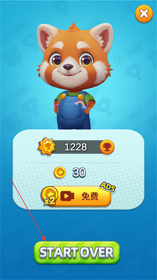 4、若游戏结束,查看获得的金币和星星数量,点击STARTOVER按钮,可选择观看广告将金币数量翻倍后重新开始游戏。