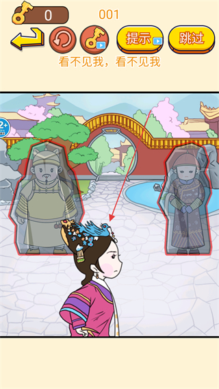 1、进入游戏关卡,留意距离被发现还有10秒倒计时,快速选择躲藏位置,比如躲到石像后。