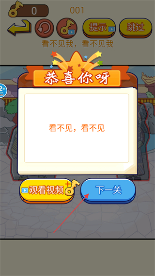 4、成功躲避后,出现恭喜提示,点击下一关按钮,开启新挑战,也可选择观看视频获取奖励。