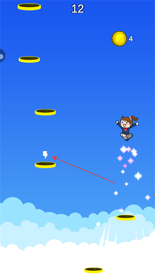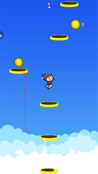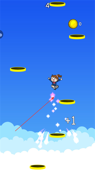 1、进入游戏,操控角色起跳,使其跳到上方的圆形平台上,每成功跳到一个平台,分数屏幕左侧数字增加。