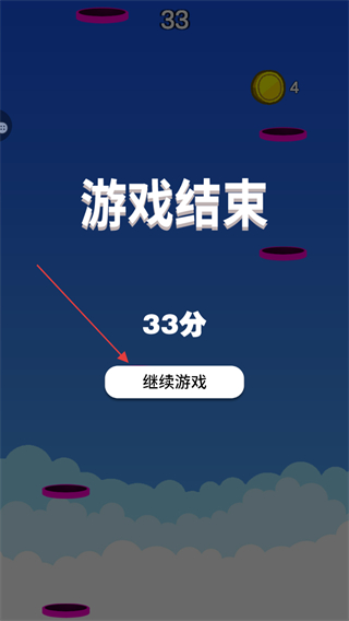 4、若角色未能跳到平台上导致掉落,游戏结束,可点击继续游戏重新挑战。