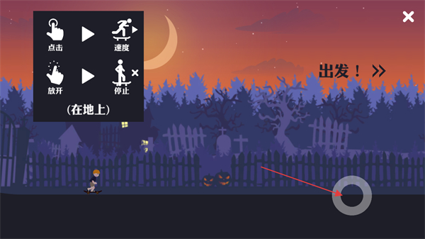 1、进入游戏,查看操作提示,在地面时,点击屏幕操控角色加速,松开停止,点击右侧圆环可开始游戏。