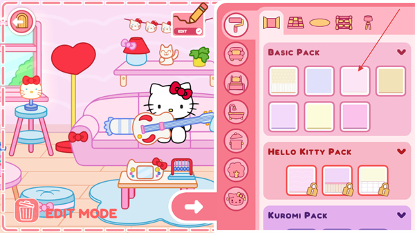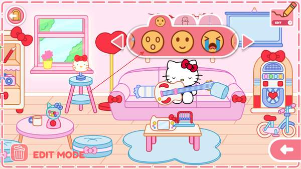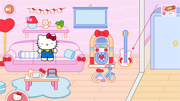 2、进入房间内,能让凯蒂猫随意进行移动,点击周边的道具做出弹吉他、移动等动作。