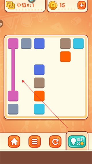 1、观察紫色方块位置,规划垂直路径,连接相同紫色方块,完成连线。