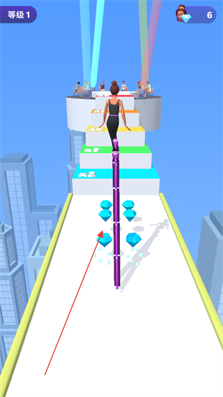 1、操控角色在跑道上奔跑,收集紫色鞋跟,增加高跟鞋高度。
