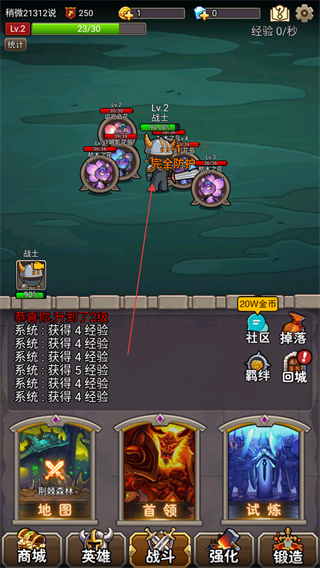 1、操控战士在地图如黑锋丛林中自动战斗,攻击怪物获取经验和金币。