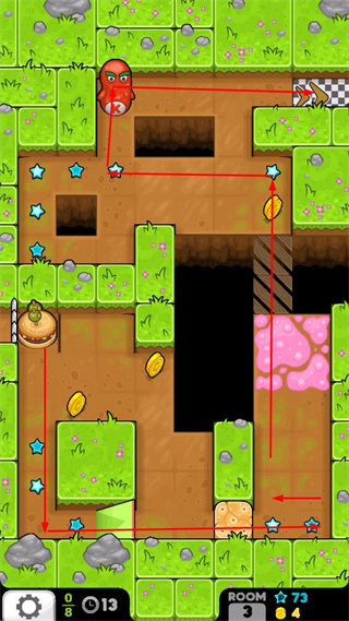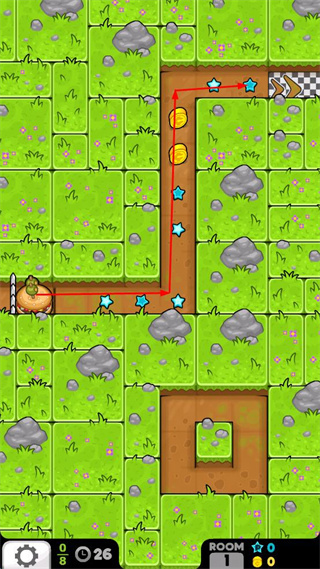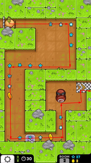 2、跟随红色路径指引,收集星星和金币,沿着路线向终点移动。