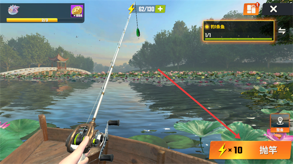 1、点击抛竿按钮将钓饵抛入水中,抛竿前可观察水域环境,选择鱼群活跃的区域,提升中鱼概率。