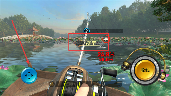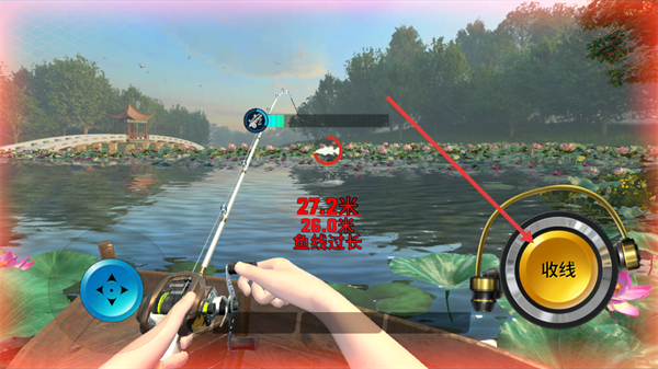 4、收线时若出现摆竿提示,需通过左侧方向键按照指示方向摆动鱼竿,控制鱼的游动方向,防止鱼逃脱。