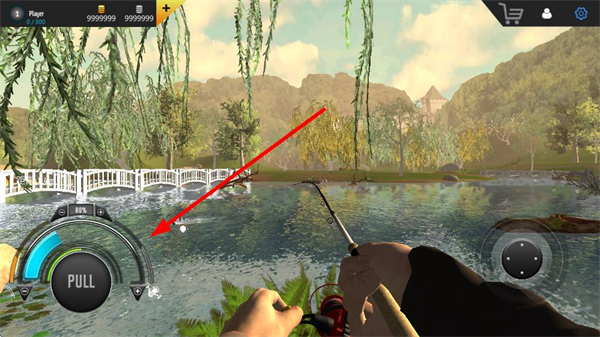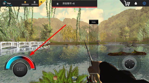 2、点击抛投按钮将钓饵抛入水中,抛投时需关注力度条,控制抛投距离与精度,力度适中可让钓饵落入理想钓点。