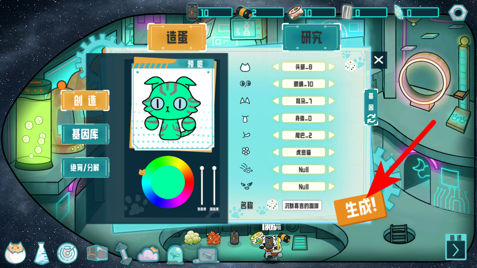3、在造蛋界面中,选择头部等基因部件,调整颜色参数后点击生成按钮,完成卵生猫的创造,这一步是个性化猫咪的核心操作,打造出独一无二的卵生猫角色。