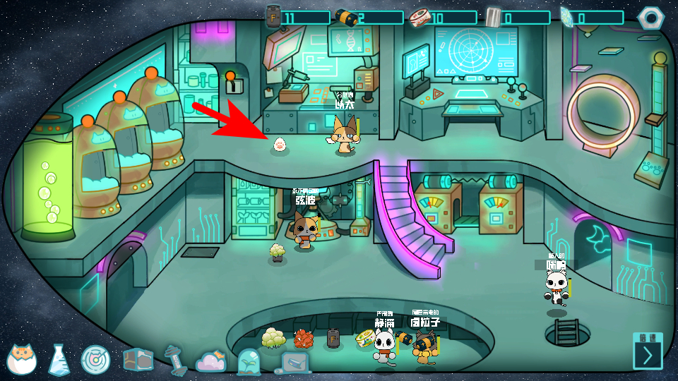 2、进入飞船场景后,点击造蛋的设备区域,进入造蛋界面,此操作是创建专属卵生猫的关键步骤,通过与飞船内的设备交互,可开启基因部件选择等造蛋环节。