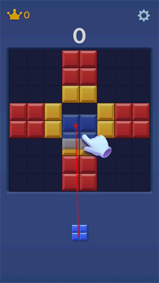 1、将底部蓝色方块向上移动至中间蓝色方块位置,使相同颜色方块相连消除,初始分数为0皇冠数量为0。