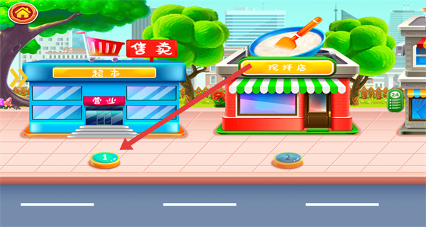 2、在场景选择界面,点击标有“1”的超市图标,进入超市购买材料。