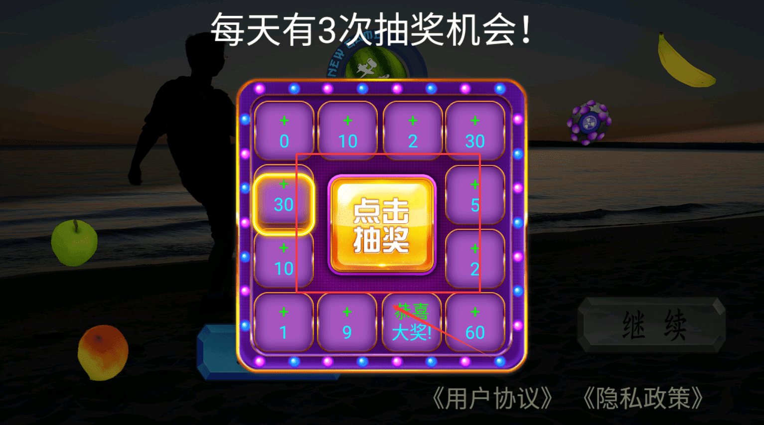 3、游戏中包含多种水果类型,如橘子、菠萝、椰子、香蕉、西瓜等,各类水果会搭配特殊道具出现,每种道具都具备独特的效果。