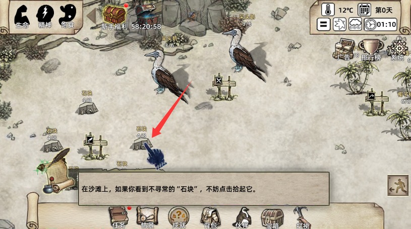 4、在沙滩区域仔细寻找石块并点击拾取操作,完成初始任务掌握生存基础技能。