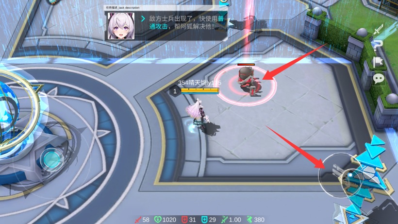 3、点击右下角攻击按钮发动普通攻击操作,配合技能连招对敌人造成有效持续伤害。