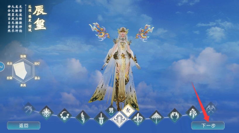 2、选择角色的性别与职业发展方向路径,确认后点击下一步继续创建详细流程。