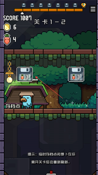 2、场景中的金币、萝卜是收集元素,临时收集的萝卜在离开关卡后会重新刷新。