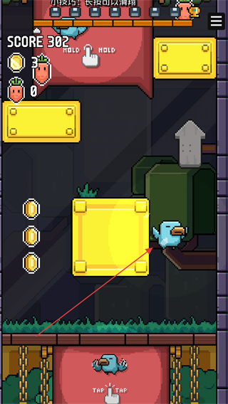 1、操控小鸟移动,触碰黄色方块获取分数,同时收集金币提升得分。