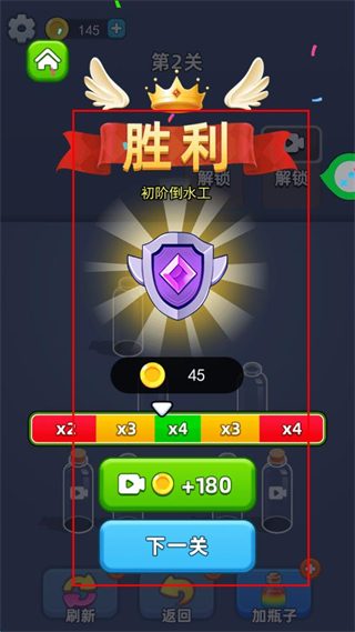 4、完成所有同色液体的倾倒后,界面会出现通关提示,此时可确认第1关的操作步骤已顺利完成。